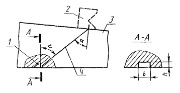 1 - отверстие для определения угла ввода луча, ширины основного лепестка диаграммы направленности, условной и предельной чувствительности; 2 - отверстие для проверки мертвой зоны; 3- преобразователь; 4 - блок из стали марки 20 или стали марки 3.