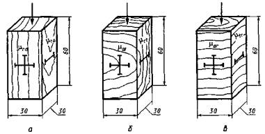 а - вдоль волокон; б - поперек волокон в тангентальном направлении; в - поперек волокон в радиальном направлении