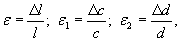 Деформацию образца в продольном (ε) и поперечных направлениях (ε1 и ε2) вычисляют с точностью до 0,0005 по формулам:
