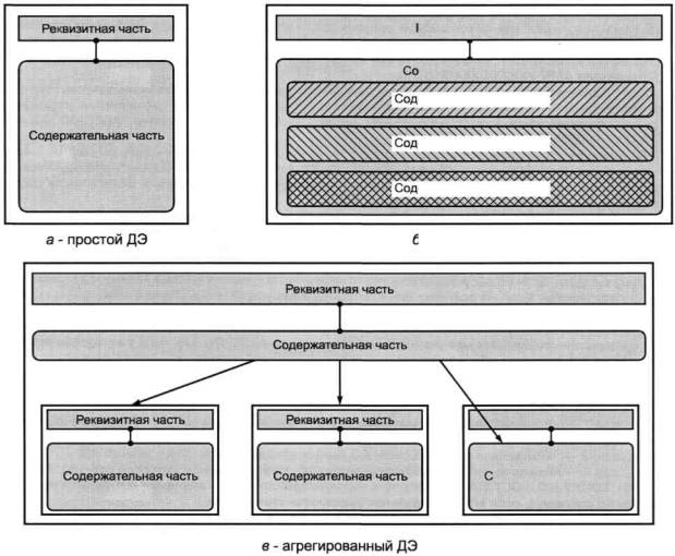 - в составном ДЭ содержательная часть реализована в виде нескольких ИЕ, связанных друг с другом ссылками, как правило, определяемыми применяемым форматом данных;