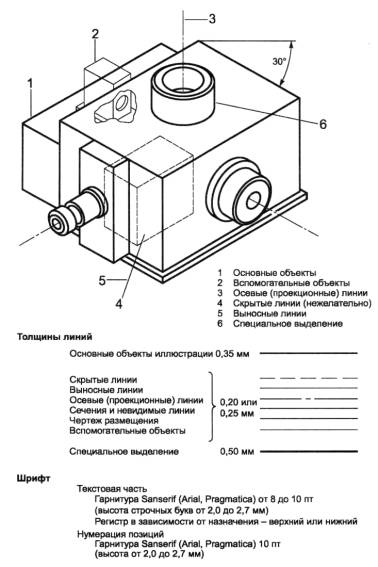6.17 Общие для всех иллюстраций требования и символы (стрелки, направления видов, толщины размерных и выносных линий, шрифты и размеры шрифтов иллюстраций и т.д.), как правило, устанавливает разработчик, если иное не указано в техническом задании. Пример оформления требований приведен в приложении Б.