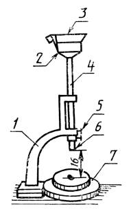 1 - станина; 2 - деревянный диск; 3 - фарфоровая чашка; 4 - цилиндрический стержень; 5 – винт; 6 – упор; 7 - опорная плита |