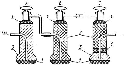 Каждую очистительную систему собирают из нескольких U-образных трубок типа TX-U-2-200 или TX-U-3-200 по ГОСТ 25336 или трубок Мидвэйла, наполненных следующими реагентами в установленном порядке по ходу газа: