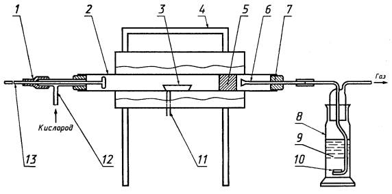 Взвешивают около 0,5 г пробы с точностью до 0,1 мг. Помещают навеску в чистую сухую лодочку для сжигания, распределяя ее по дну ровным слоем. Засыпают навеску оксидом алюминия массой около 0,5 г (4.3) так, чтобы оксид алюминия полностью покрывал навеску пробы в лодочке. Подсоединяют приведенную в рабочее состояние и взвешенную поглотительную систему. Вставляют лодочку с навеской во входной конец трубки для сжигания так, чтобы центр лодочки находился на расстоянии 240 мм от центра самой горячей зоны. Вставляют каучуковую пробку с полностью отведенным кварцевым или стальным толкателем и продолжают продувку кислородом со скоростью 300 см3/мин. Через 1 мин продвигают лодочку вперед на 40 мм. В конце каждого из пяти следующих минутных интервалов с помощью толкателя продвигают лодочку вперед на 40 мм, каждый раз отводя толкатель в исходное положение для предотвращения его разрушения. После последнего продвижения центр лодочки должен оказаться в середине самой горячей зоны. Выдерживают лодочку в горячей зоне в течение 4 мин.