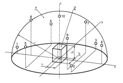 Измерения проводят на звукоотражающей плоскости. Точки измерений выбирают на полусферической измерительной поверхности (площадью S = 2πr2), охватывающей машину и опирающейся на звукоотражающую плоскость.