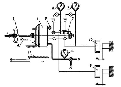 1 - вакуумный усилитель; 2 - главный тормозной цилиндр; 3 - динамометр сжатия; 4 - указатель перемещения штока; 5 - индикатор деформации; 6,7 - манометры; 8 - вакуумметр; 9, 10 - нагрузочные цилиндры; 11- нагревательный элемент; A - атмосфера; B - вакуум; F - сила, прикладываемая к штоку усилителя; Δ - зазор между штоком нагрузочного цилиндра и упором