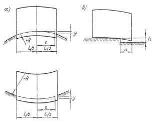 Черт. 1. Схемы вертикальных перемещений земной поверхности при подработке, вызванных кривизной (а) или образованием уступа (б)