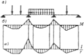 Черт. 21. Эпюры изгибающих моментов и кривизны для железобетонных элементов постоянного сечения а ¾ схема расположения нагрузи; б ¾ эпюра изгибающих моментов; в — эпюра кривизны