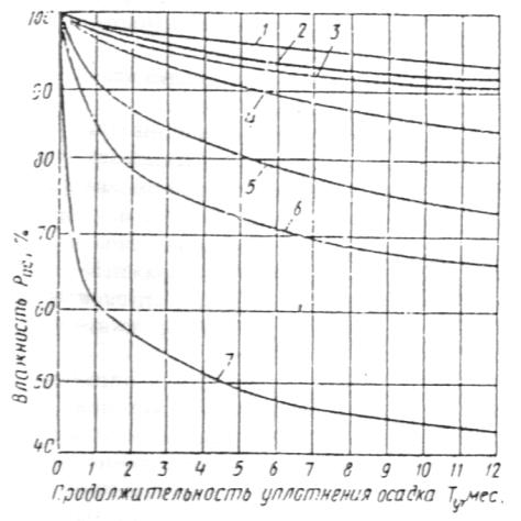 или летне-осеннего периодов, принимаемые по рис. 3, 4, 5 и 6 в зависимости от продолжительности уплотнения осадка, определяемой от середины весеннего или летне-осеннего периодов до наступления периода устойчивого мороза.