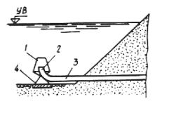 1 - зонтичный оголовок; 2 - оголовок водозаборной трубы; 3 - водозаборная труда; 4 - опорная конструкция