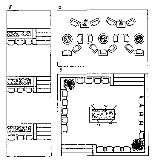 Рис. 7. Примеры схем построения зрительского комплекса а — выделение зоны тихого отдыха зеленью, средствами дизайна; б, в — выделение зоны тихого отдыха уровнем пола