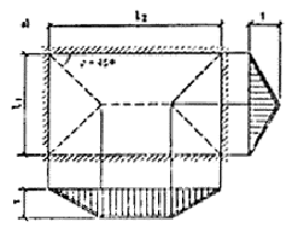 6.32. Для свободно опертой по трем сторонам плиты, армированной сеткой, все стержни которой доводятся до опоры, изгибающие моменты М1 и М2, по которым определяется площадь арматуры соответственно вдоль пролетов l1 и l2, вычисляются по формулам: в случае, если l2 > 0,25gsh02/h01, то М1 = Mo(l l/3nорt/l); (174) М2 = Mon2орt/(3l), (175) где nорt = gsh02/(2lh01); (176) в случае, если l2 £ 0,25gsh02/h01 М1 = Mo/t(4nорtl); (177) М2 = Mo(nорt 4/3l), (178) где
